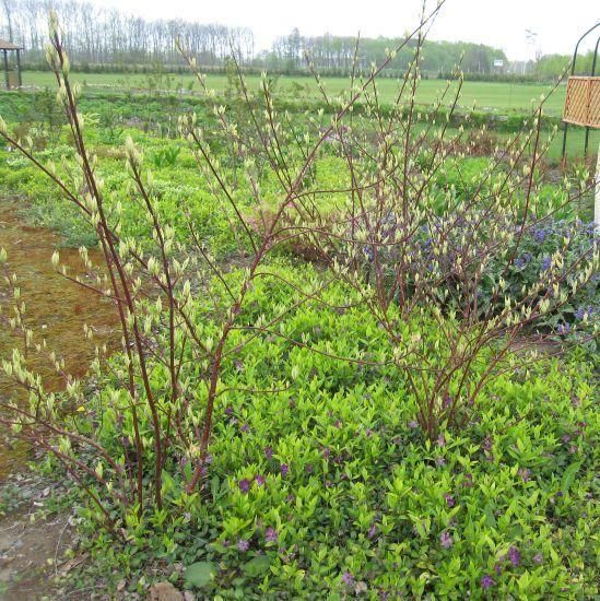 落葉低木。枝は赤、葉はグレーグリーンに白斑。爽やかな印象です。