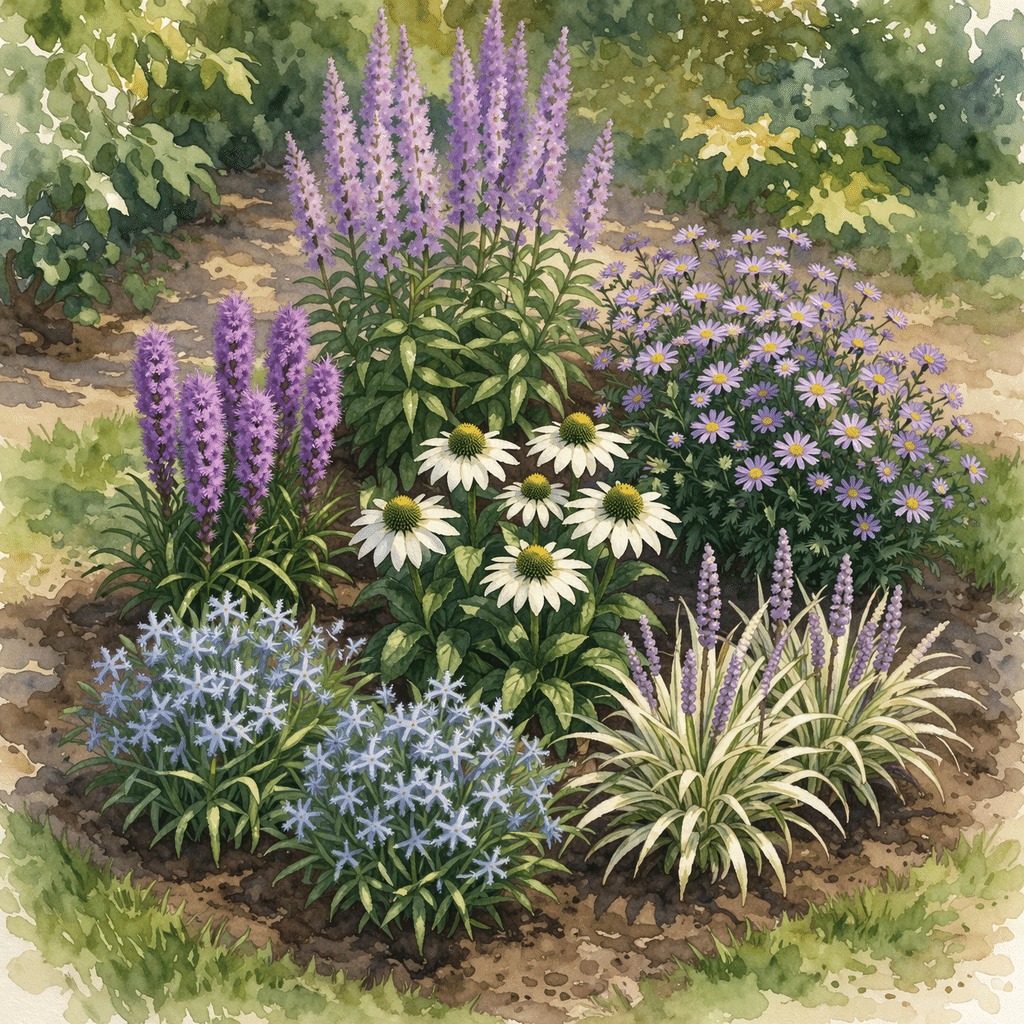 寒色だけで庭を組むとき、青と紫だけだと全体が沈みがちになります。そこに白が入ることで、視線の「休憩ポイント」ができる。白は他の色を引き立てる色なので、隣のリアトリスの紫やカーリメリスの薄紫が、エキナセアの白があることでより鮮やかに見えます。