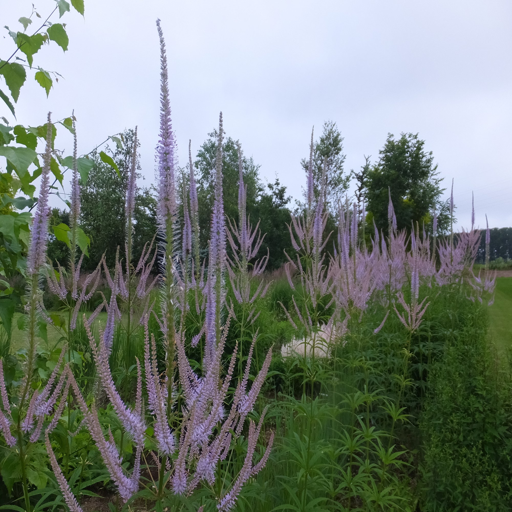 細い花穂がすっと直立する姿が、寒色の庭全体に縦のラインを与えてくれます。ラベンダー色の穂が何本も立ち上がる様子は、遠くから見てもはっきりとした構造が感じられます。このセットに「高さ」がなかったら、同じ色味の花がのっぺりと並ぶだけの庭になってしまう。ベロニカストラムがいることで、庭に奥行きが出ます。