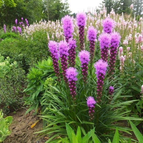 このセットの中では「個性」を担当する品種です。寒色で揃えた庭は統一感が出る反面、ともすると単調になりがち。リアトリスの穂状の花は、丸い花形のエキナセアや小花のカーリメリスとは明らかに形が違うので、中景の中に花の「形のリズム」が生まれます。