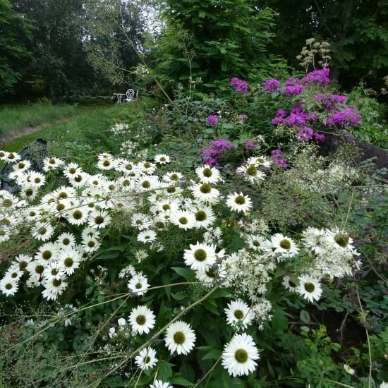 緑がかった中心部をもつ白花のエキナセアです。このセットの中で唯一の白花で、青・紫の花の間に「抜け」をつくる役割を果たしています。
